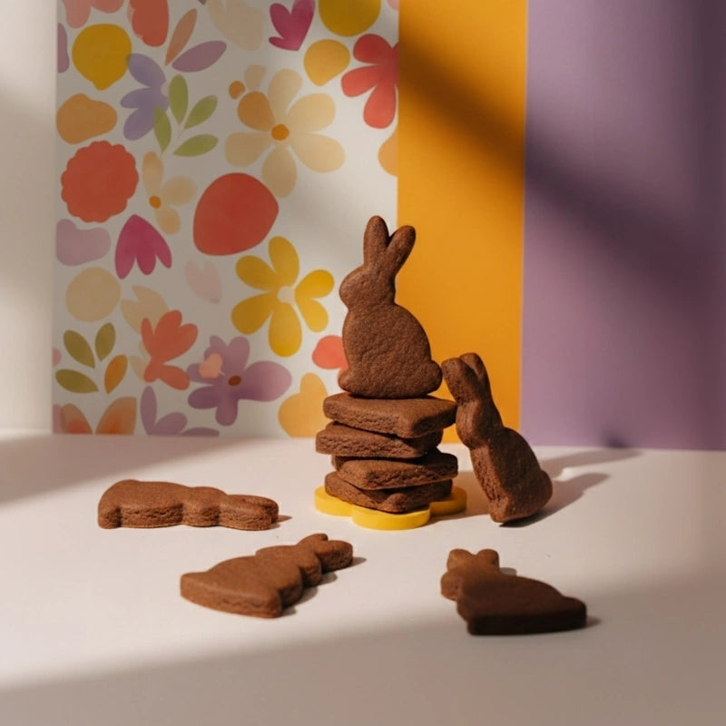 Sans glaçage, ces biscuits révèlent pleinement la richesse du cacao et le croquant du sablé pur beurre. À partager lors d’une chasse aux œufs, à déposer sur la table de Pâques ou à offrir comme une attention gourmande facile à savourer à tout moment de la journée.