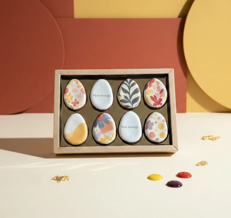 Huit biscuits sablés décorés à la main composent cette galerie printanière, dont plusieurs œufs personnalisables avec un prénom, un mot doux ou un message d’entreprise. Une attention unique qui transforme le cadeau de Pâques en souvenir aussi personnel que gourmand.