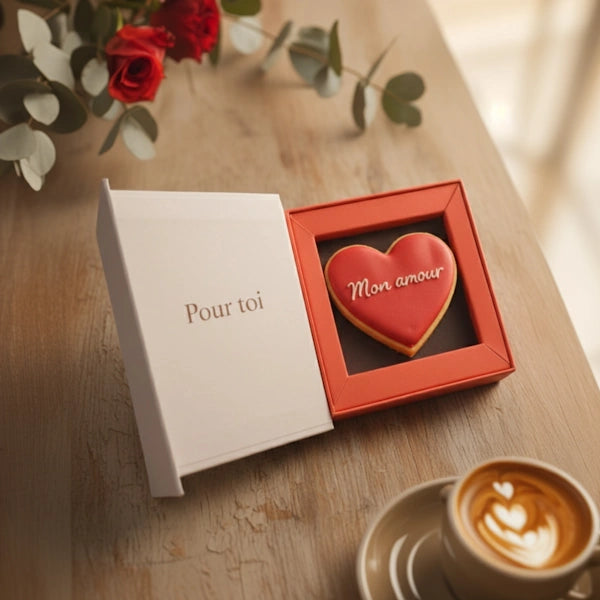Le grand cœur Le Message est une création gourmande imaginée pour dire l’essentiel, simplement. Un biscuit personnalisé en forme de cœur, à offrir comme une déclaration douce, élégante et pleine d’émotion dans un beau coffret aimanté.