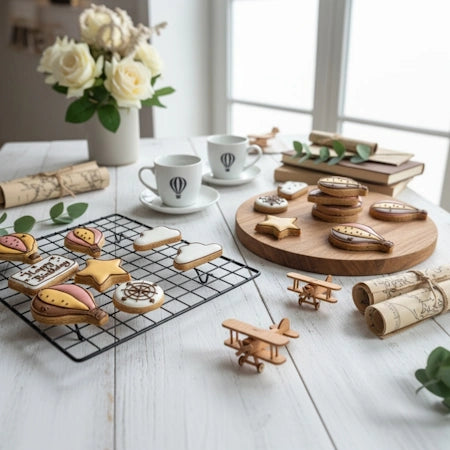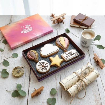 Le coffret de l'explorateur contient 6 sablés : 1 petite montgolfière, 1 grande montgolfière, 1 boussole, 1 étoile, 1 plaque "Happy birthday" et 1 nuage personnalisable avec le prénom.
